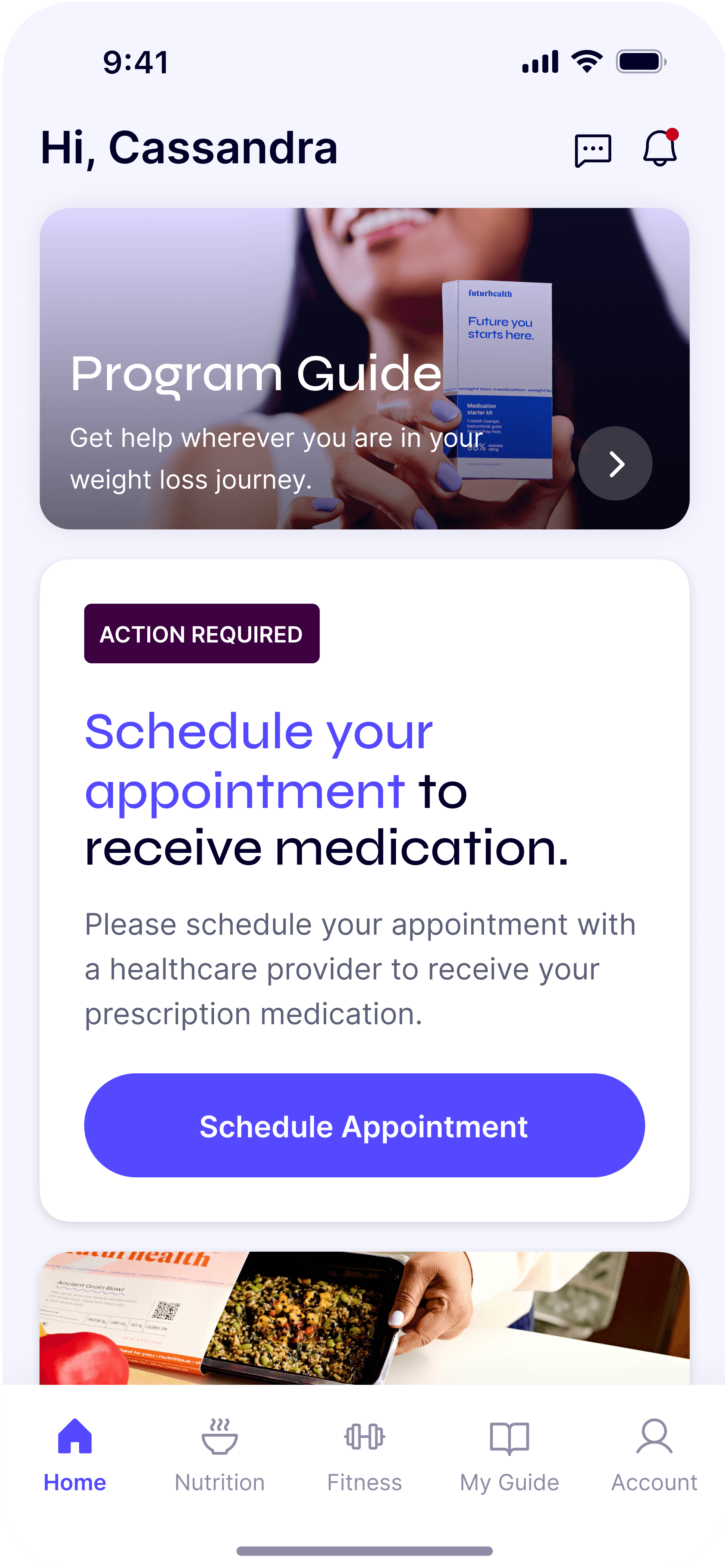 Access to your appointments, medication, nutrition plans, meal boxes, fitness, and guides all in one place